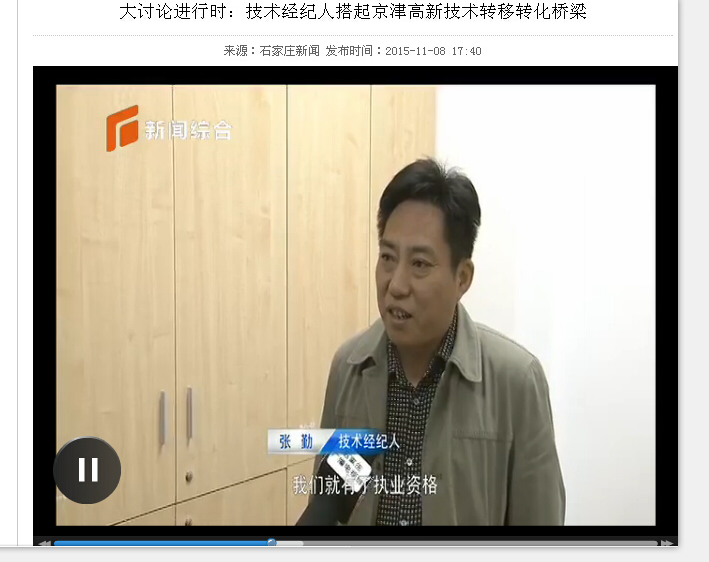 2015年11月7日,張勤董事長接受了石家莊電視臺采訪。今后,可以利用北京、天津、河北三地的科技資源,為供需雙方進行技術對接,使大量有錢沒有項目的企業(yè),有成果沒有資金的科研院所,通過技術對接尋找到適合自己需要的合作方,實現技術資源的優(yōu)化配置。