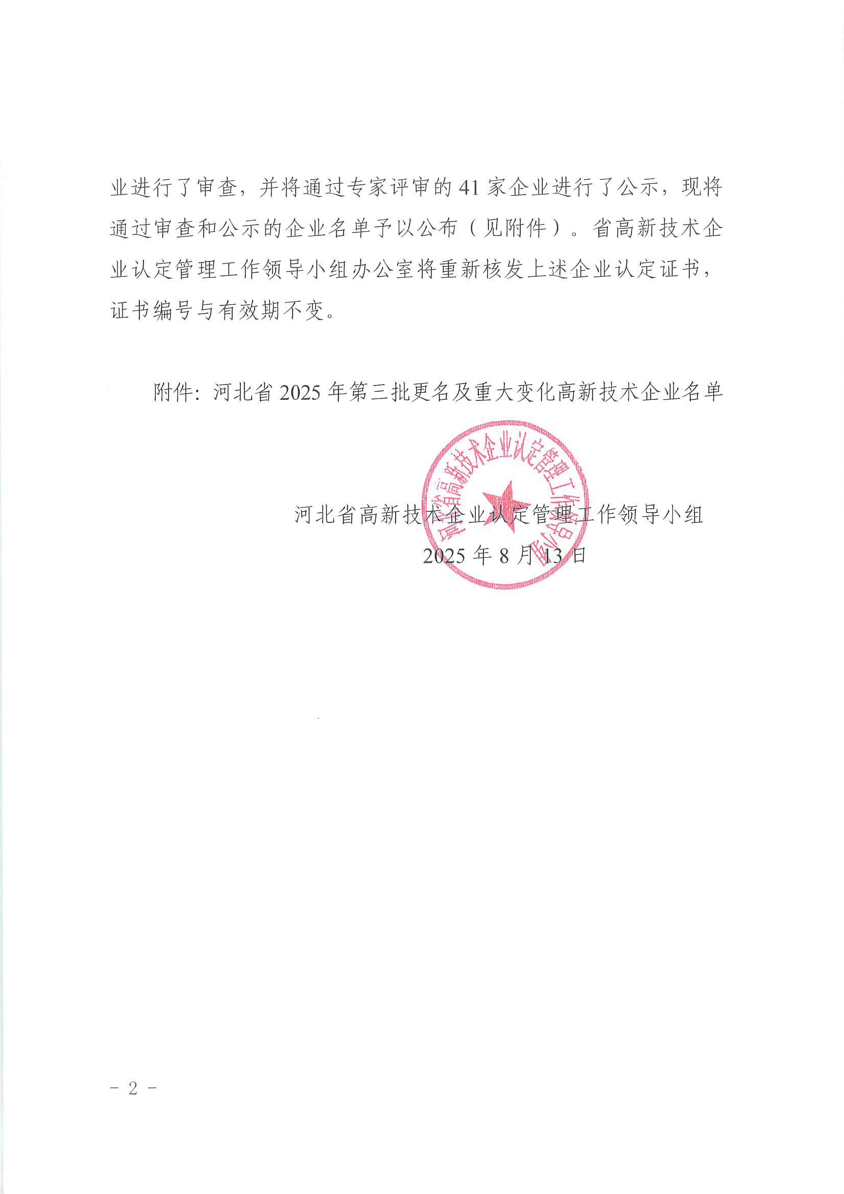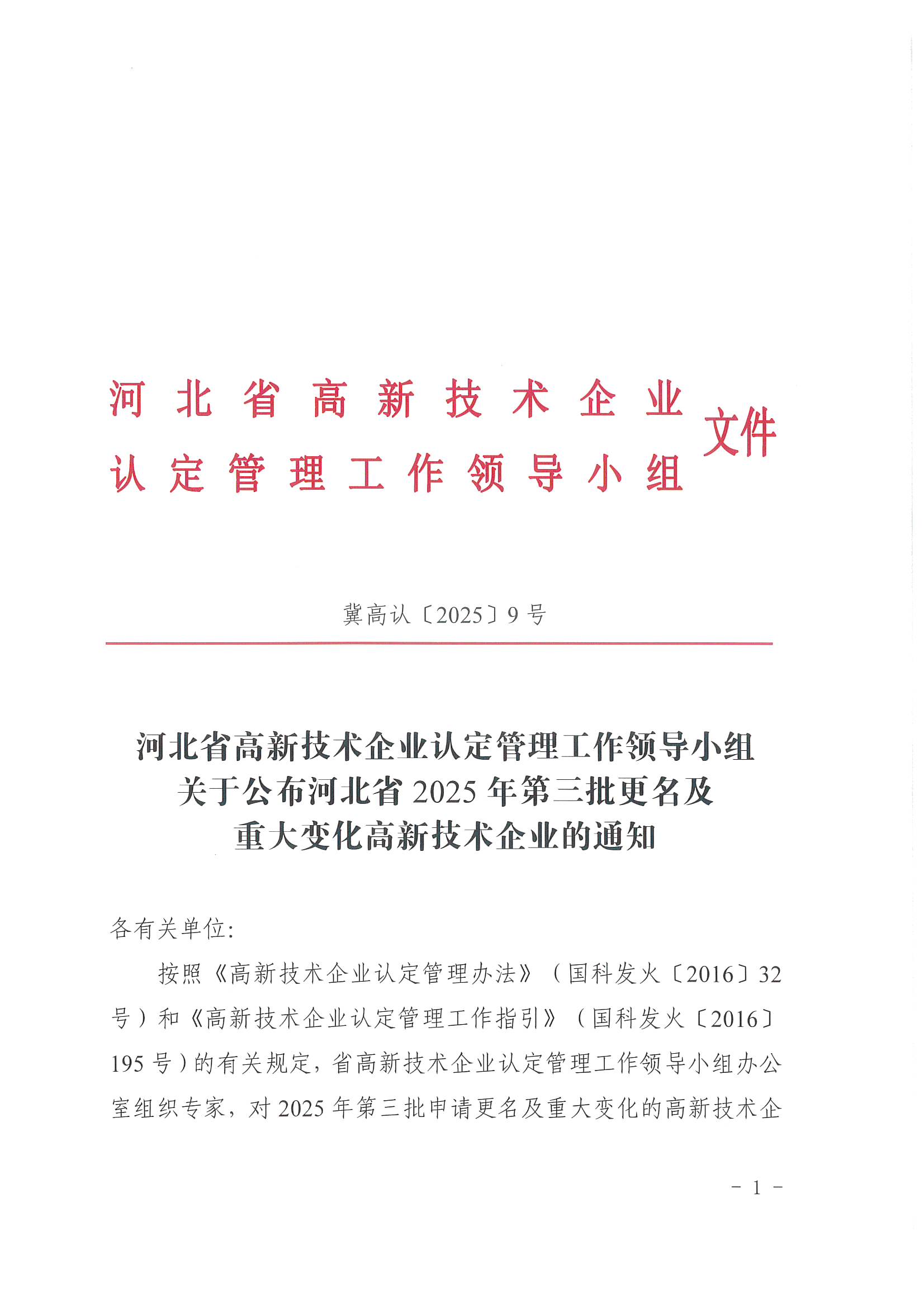 關(guān)于公布河北省2025年第三批更名及重大變化高新技術(shù)企業(yè)的通知